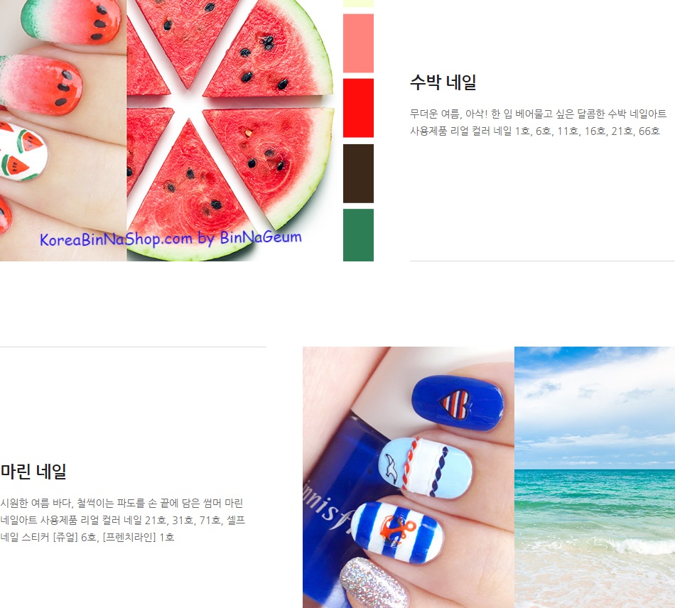 - Hãng Innisfree có đưa đề xuất kết hợp một số kiểu nail đẹp với các màu cụ thể để người mua có thể lựa chọn làm theo như kiểu Sơn móng tay Dưa Hấu: gồm màu số 1, 6, 11, 16, 21, 66; hoặc các màu cho phong cách biển và sóng biển mùa hè số 21, 31, 71 cùng với sticker móng chủ đề biển hè