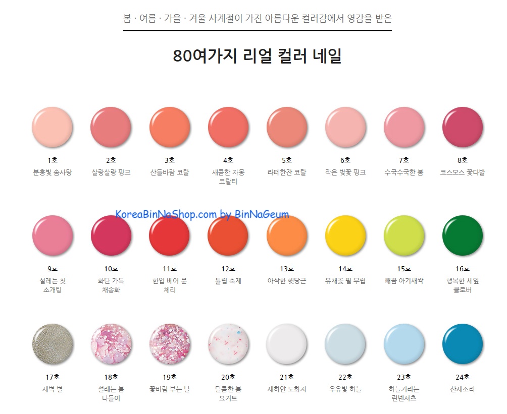 - Set sơn móng tay của Real Color Nail có tất cả 80 màu sơn phù hợp cho phong cách màu của 4 mùa trong năm là Xuân Hạ Thu Đông.