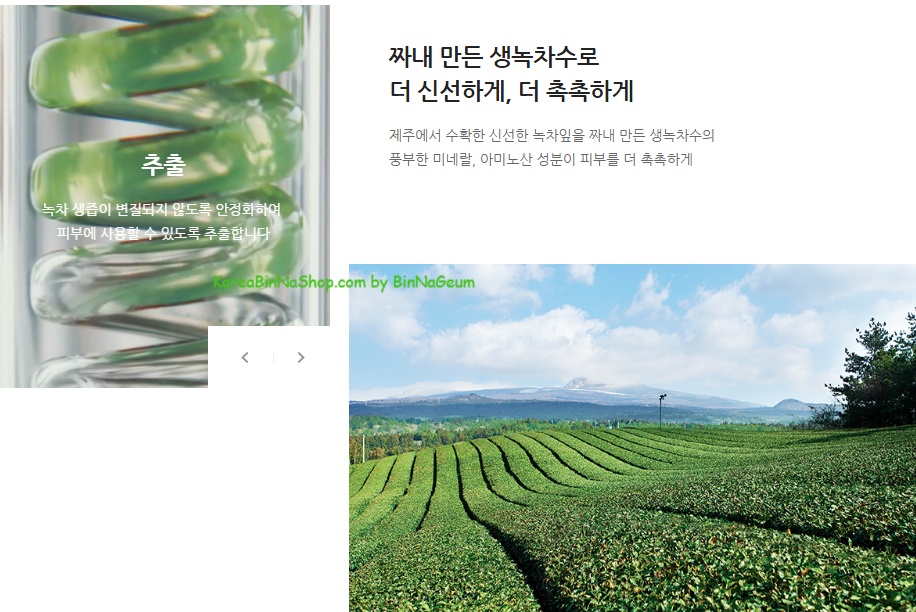 - Chiết xuất xịt khoáng được chắt từ lá trà xanh tươi gieo trồng không thuốc nông nghiệp và thu hoạch tại hòn đảo Jeju Hàn Quốc chứa nhiều chất khoáng và axit amin giúp cung cấp trực tiếp dưỡng ẩm đủ cho làn da khô ráp, thiếu sức sống.
